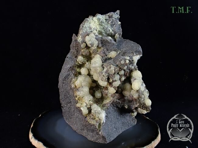 ベースとなる鉱物の隙間に球状の黄色い結晶が集まった標本です。